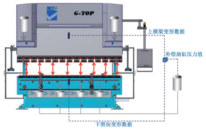 為了保證高精度的鈑金折彎,在折彎機的上橫梁(滑塊)和下橫梁(工作臺)安裝了傳感器(見圖5),在工作狀態時,將上、下橫梁的變形量實時準確地反饋到數控系統(PC),數控系統經過計算比對后,輸出相應的補償值驅動補償油缸進行動態補償,以獲得滿意的制件精度。