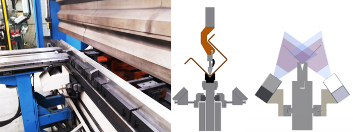 (1)通過激光在線檢測工件回彈后的折彎角度;(2)受力檢測系統自動計算折彎回彈量;(3)件根據下模寬度的不同可自動調整進深;(4)通過閉環的激光角度在線測量系統,保證折彎成品率達到99.5%以上。