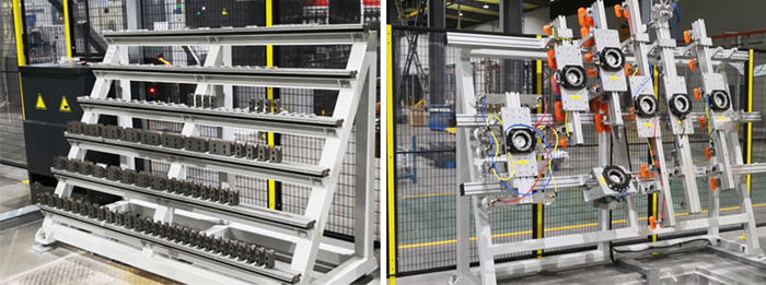 機器人自動(ATC)換抓手(見圖8)、換模是鈑金領域完全的智能自動化操作方式,該方式由自動換模軟件、機器人和模具庫(見圖9)組成。當選配自動換模系統時,精密折彎中心從此可以全自動隨機折彎小批次的不同產品。利用自動更換模具的功能,折彎機中的模具不再成為限制因素,可全程無人處理部件。機器人自動機械裝置的抓手更換模具的速度非常快,隨時可折彎下批部件。