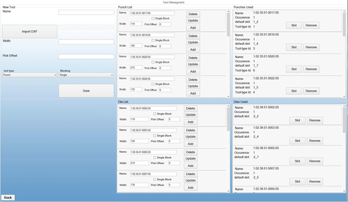 (1)通過附件的圖形化界面,用戶能夠立即看到整個系統的現狀;在該界面的右邊,有一個圖形表示模具的狀態,對這些模具當前的位置進行分區。(2)整個界面包括折彎上模區域、折彎下模區域和模具庫;模具的展示遵循模具本身的尺寸,被夾持的工位位置。(3)上下模用不同顏色區分;在該界面的左上邊,有對折彎機上所裝模具的詳細描述。兩個部分:一個是解釋上模,一個是解釋下模,通過識別碼和現有位置來描述被夾持的模具。