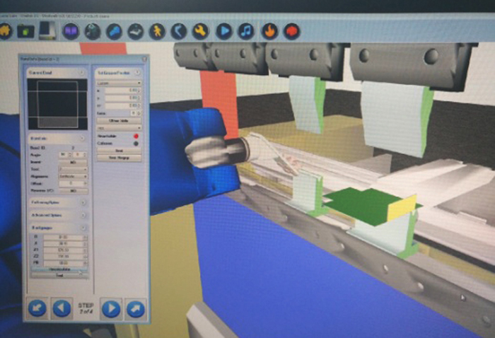 在機器人折彎單元中我們應用了參數化編程軟件、離線編程軟件(見圖12)和生產管理軟件,同時二次開發了折彎隨動、自動換模、自動換抓手、柔性碼垛、實時補償、板邊尋邊、柔性翻轉技術和總線控制技術。可極大地滿足各類客戶鈑金折彎的技術和軟件需求。