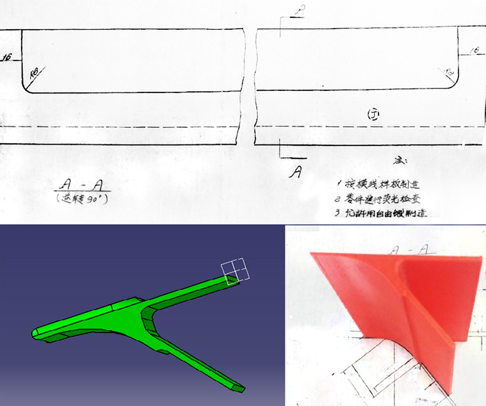 筆者所在公司二翻飛機在歸建后,正常訓練過程中發生撞鳥事故,造成飛機的進氣道及周邊結構損傷,大部分結構件需要更換,而該機是20世紀末生產的,制造廠多年不再生產該機型。X-0402-5是受力件,受損嚴重,修理中需換新,采購部門確定該零件已無采購渠道,只能自制,但圖紙技術要求規定按模線樣板制造(見圖1)。模線樣板早已被制造廠銷毀,圖紙尺寸不全,技術人員決定通過逆向技術使用CATIA軟件對零件進行逆向曲面重建,完成數模設計,然后使用3D打印制造出零件,與原零件對比,發現3D打印制造出零件尺寸完全符合修理要求。