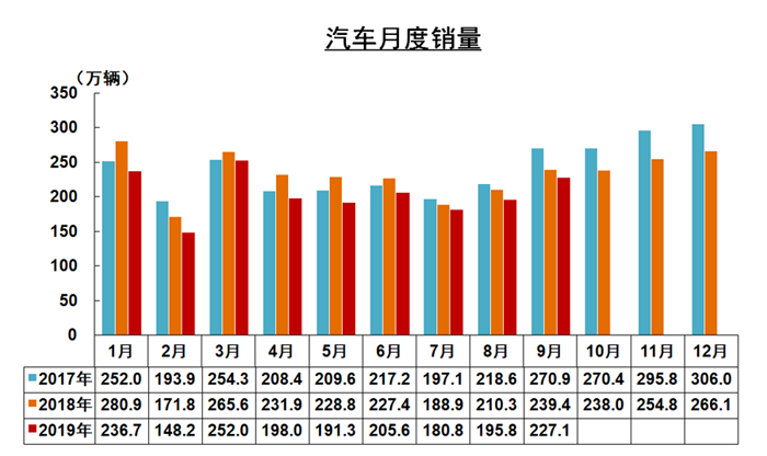 今年以來,國際環境日趨復雜嚴峻,世界經貿增長放緩,在全球經濟下行、國內結構性矛盾突出以及中美經貿摩擦持續的背景下,我國經濟下行壓力有所加大,但經濟仍運行在合理區間。盡管宏觀經濟總體穩定發展,我國汽車工業在消費信心不足、部分地區提前切換國六標準等不利因素影響下,總體表現較弱,尤其是上半年更是出現了10%以上的下降。三季度,在一系列穩就業、穩金融、穩外貿、穩外資、穩投資、穩預期的政策作用下,汽車產銷降幅出現了收窄。