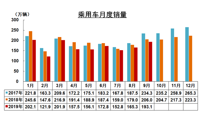 9月,我國乘用車產銷分別完成186.5萬輛和193.1萬輛,比上月分別增長10.1%和16.8%,比上年同期分別下降7.9%和6.3%,產量降幅比上月擴大7.2個百分點,銷量降幅縮小1.4個百分點。