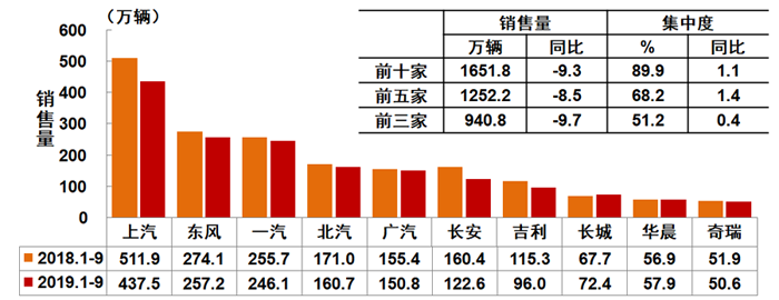 1-9月,汽車銷量排名前10位的企業集團銷量合計為1651.8萬輛,比上年同期下降9.3%,高于行業增速1.0個百分點。占汽車銷售總量的89.9%,高于上年同期1.1個百分點。