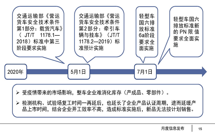 此前生態環境部發布的國六排放標準及交通運輸部發布的營運貨車安全技術標準等將陸續實施,但受本次疫情的負面影響,企業難以在相關標準實施之日前消化現有庫存(產品、零部件)。同時,檢測機構、試驗場復工時間一再延后,也延長了企業產品認證周期,進而延緩產品上市時間,結合企業開工效率不高,最終可能導致部分企業在標準實施后無法按計劃銷售新產品。