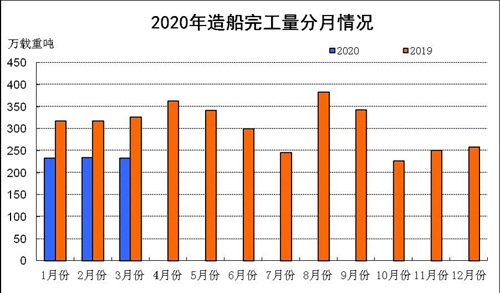 2020年1-3月份,受全球新冠肺炎疫情蔓延的影響,國際航運市場持續低迷。我國造船完工量和手持船舶訂單量同比下降,受去年同期基數較低的影響,我國新承接船舶訂單小幅增長。重點監測企業工業總產值等主要經濟指標持續下降。