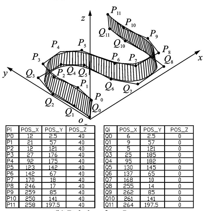 NAS試件主要對(duì)機(jī)床的幾何精度敏感,而對(duì)動(dòng)態(tài)精度不敏感,按照此標(biāo)準(zhǔn)驗(yàn)收的五軸機(jī)床在加工飛機(jī)結(jié)構(gòu)零件復(fù)雜曲面時(shí),大量出現(xiàn)過切、欠切、表面嚴(yán)重波紋等情況。為此,由中國(guó)主持修訂、由中航工業(yè)成都飛機(jī)工業(yè)(集團(tuán))有限責(zé)任公司基于航空制造經(jīng)驗(yàn)及多年自主深入研究成果提出的,ISO10791-7: 2020《加工中心檢驗(yàn)條件第7部分:精加工試件精度檢驗(yàn)》國(guó)際標(biāo)準(zhǔn),獲國(guó)際標(biāo)準(zhǔn)化組織(ISO)批準(zhǔn)正式發(fā)布,成為國(guó)際標(biāo)準(zhǔn) [16]。如圖20所示,試件由S形走向的扭曲曲面形成的等厚度緣條和矩形底座組成。S型緣條由上下兩個(gè)平面上的四條S形曲線相互交叉構(gòu)成。由于緣條與底平面的夾角連續(xù)變化,在連續(xù)加工S型曲面緣條兩側(cè)時(shí),可檢查五軸數(shù)控機(jī)床連續(xù)變軸加工零件表面時(shí)的粗糙度、厚度、輪廓誤差等,檢驗(yàn)機(jī)床開、閉角轉(zhuǎn)換時(shí)的性能,更好地反映多軸加工中各運(yùn)動(dòng)部件的綜合精度和動(dòng)態(tài)響應(yīng)特性,更能體現(xiàn)航空薄壁件的機(jī)床加工性能。在圖20中,直紋面A由兩條準(zhǔn)均勻三次B樣條曲線定義,這兩條B樣條曲線分別由兩組控制點(diǎn)即Mi(i=0-11)和Ni(i=0-11)定義。與直紋面A相似,直紋面B也由兩條準(zhǔn)均勻三次B樣條曲線進(jìn)行定義,兩條樣條線分別由兩組控制點(diǎn)Pi(i=0-11)和Qi(i=0-11)定義[17]。