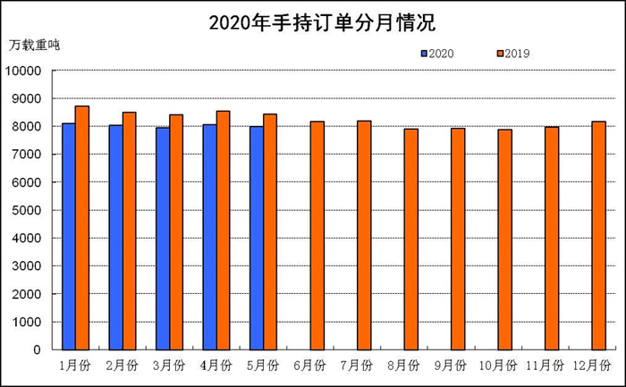 1-5月份,全國造船完工1332萬載重噸,同比下降20%。承接新船訂單1158萬載重噸,同比下降1.2%。5月底,手持船舶訂單7992萬載重噸,同比下降5.3%,比2019年底下降2.1%。