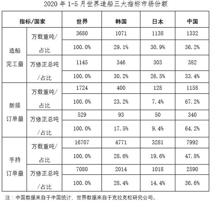 中國船舶工業行業協會最新數據顯示,2020年1-5月份,國際航運市場延續低迷態勢,全球新造船市場需求不足,我國三大造船指標同比下降。重點監測企業工業總產值等主要經濟指標同比下降。