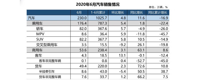 中國汽車工業協會今天下午召開的信息發布會最新數據顯示,2020年6月,我國汽車產銷延續了回暖勢頭,當月產銷量環比和同比保持增長,其中商用車同比增速更為明顯。6月,我國汽車產銷分別達到232.5萬輛和230.0萬輛,環比增長6.3%和4.8%,同比增長22.5%和11.6%。
