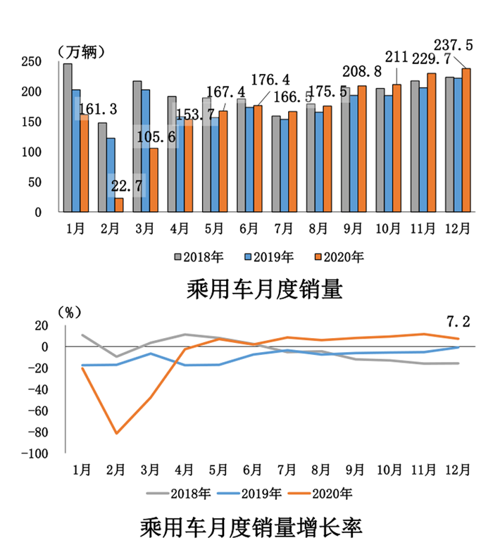 2020年12月,乘用車產銷分別完成233.1萬輛和237.5萬輛,產量與上月持平,銷量環比增長3.3%,同比分別增長6.5%和7.2%,增幅比上月減少1和4.4個百分點。