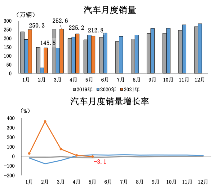 5月,汽車產銷分別完成204.0萬輛和212.8萬輛,環比分別下降8.7%和5.5%,同比分別下降6.8%和3.1%。與2019年同期相比,產銷同比增長10.3%和11.1%,產量增幅比4月擴大1.6個百分點,銷量增幅比4月回落2.4個百分點。