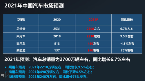 中汽協(xié)預(yù)測(cè)2021年汽車(chē)總銷量為2700萬(wàn)輛左右,同比增長(zhǎng)6.7%左右。