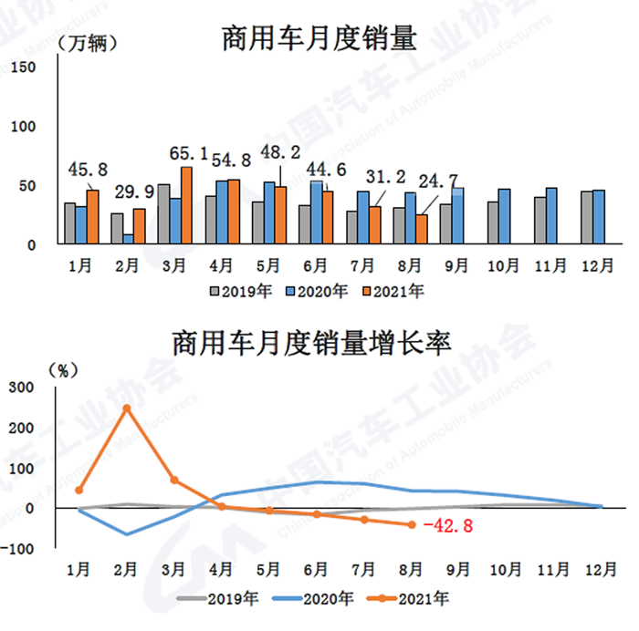 8月,商用車產(chǎn)銷22.9萬輛和24.7萬輛,環(huán)比下降27.5%和20.9%,同比下降46.2%和42.8%。在商用車主要品種中,與上月相比,貨車和客車產(chǎn)銷延續(xù)了下降勢頭,貨車降幅更為明顯;與上年同期相比,客車產(chǎn)銷呈小幅增長,貨車呈快速下降。