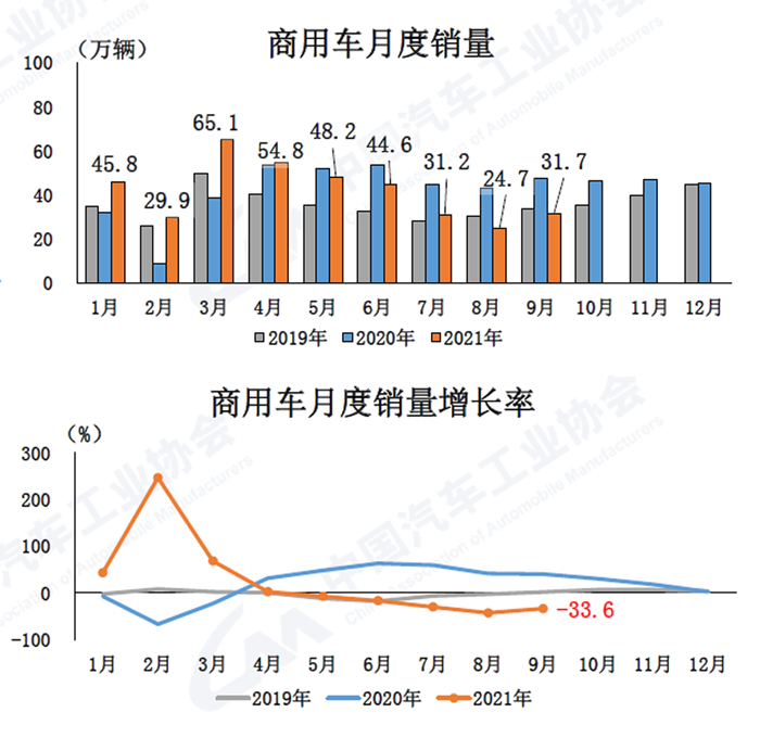 中國汽車工業協會最新數據顯示,2021年9月,汽車產銷比上月有所好轉,環比均呈較快增長,但受同期基數較高影響,同比依然呈現較快下降,商用車產銷降幅更為明顯。