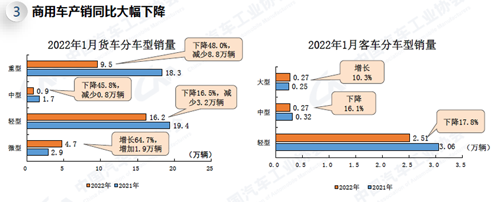 1月,商用車產銷34.5萬輛和34.4萬輛,環比下降9.3%和5.5%,同比下降28.0%和25.1%。在商用車主要品種中,與上月相比,貨車銷量略增,產量小幅下降,客車產銷均呈快速下降;與上年同期相比,貨車和客車產銷均呈下降,貨車降幅更為明顯。
