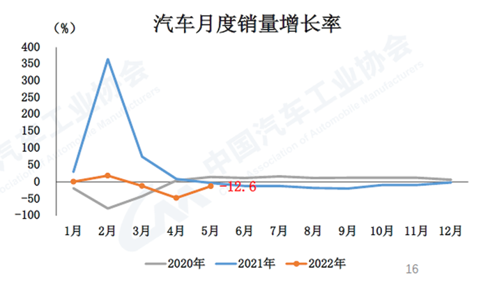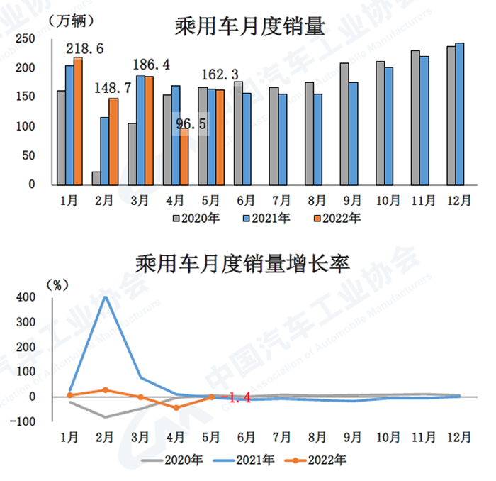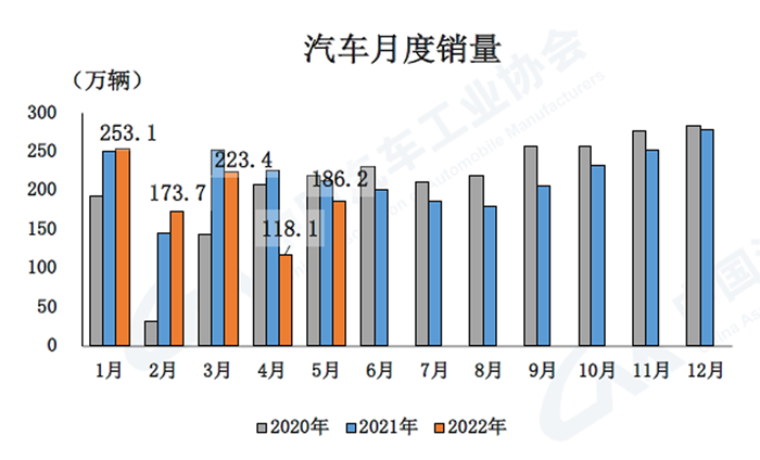 5月,汽車產銷分別達到192.6萬輛和186.2萬輛,環比增長59.7%和57.6%,同比下降5.7%和12.6%,降幅比4月分別收窄40.4個百分點和35.0個百分點。