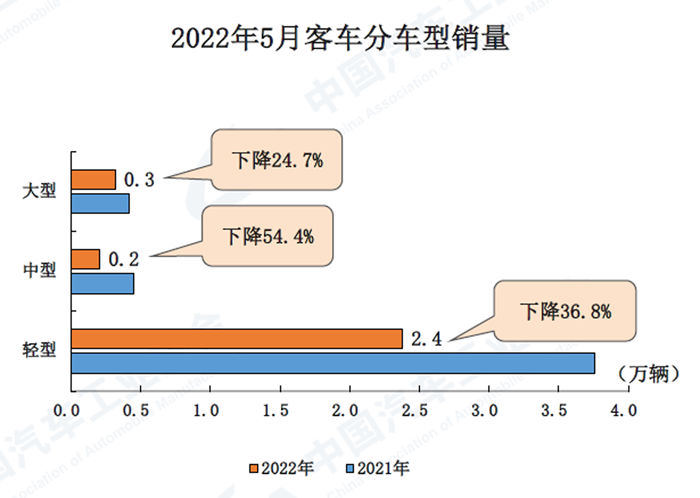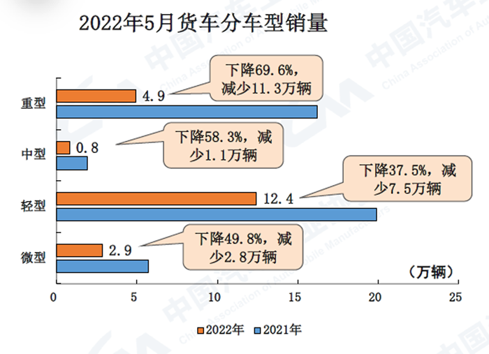 1-5月,商用車產銷142.2萬輛和142.1萬輛,同比下降39.4%和41.9%。在商用車主要品種中,與上年同期相比,客車和貨車產銷均呈較快下降。