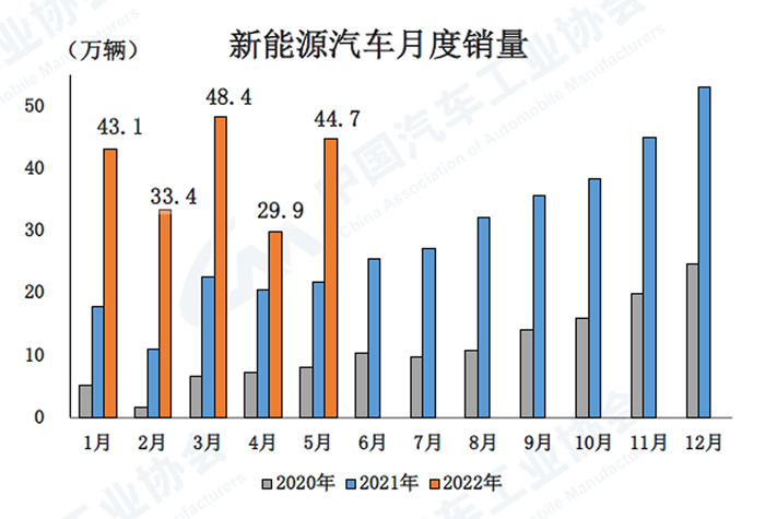 5月,新能源汽車產銷表現也較為出色,當月產銷分別達到46.6萬輛和44.7萬輛,環比增長49.5%和49.6%,同比增長均為1.1倍,市場占有率達到24.0%。