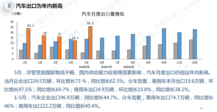 5月,汽車出口創年內新高,環比增長73%,同比增長62.3%。