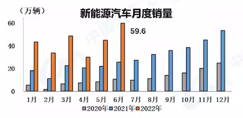 6月,新能源汽車產銷表現(xiàn)依然出色,當月產銷接近60萬輛,再創(chuàng)歷史新高。分別達到59萬輛和59.6萬輛,環(huán)比增長26.6%和33.4%,同比增長均為1.3倍,市場占有率達到23.8%。