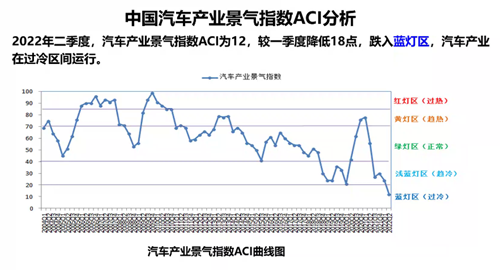 在同一場發(fā)布會上,中汽協(xié)發(fā)布二季度中國汽車產業(yè)景氣指數ACI為12,較一季度降低18點,跌入藍燈區(qū)。表明二季度汽車產業(yè)在過冷區(qū)間低位運行,且未來仍然存在一定的下行壓力。