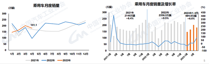 4月汽車產銷量分別達到213.3萬輛和215.9萬輛,環比分別下降17.5%和11.9%,同比分別增長76.8%和82.7%。