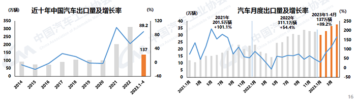 4月,汽車企業出口37.6萬輛,環比增長3.3%,同比增長1.7倍。分車型看,乘用車本月出口31.6萬輛,環比增長3.7%,同比增長2.2倍;商用車出口6萬輛,環比增長1.2%,同比增長41.6%。新能源汽車出口10萬輛,環比增長28.6%,同比增長8.4倍。