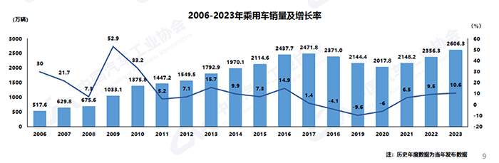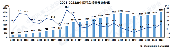 中汽協數據顯示,我國汽車產銷總量連續15年穩居全球第一。2009年,中國汽車產銷量首次雙突破1000萬輛大關,成為世界汽車產銷第一大國。2013年突破2000萬輛,2017年產銷量達到階段峰值,隨后市場連續三年下降,進入轉型調整期,2021年結束“三連降”開始回升。2023年,汽車產銷累計完成3016.1萬輛和3009.4萬輛,同比分別增長11.6%和12%。