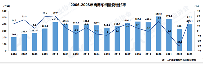 2023年12月,商用車產銷分別完成36.6萬輛和36.4萬輛,環比分別下降5.7%和0.4%,同比分別增長41.7%和25.1%。