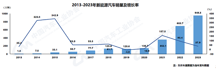 2023年,新能源汽車產銷累計完成958.7萬輛和949.5萬輛,同比分別增長35.8%和37.9%,市場占有率達到31.6%。在新能源汽車主要品種中,與上一年度相比,三大類新能源汽車品種產銷均呈明顯增長。