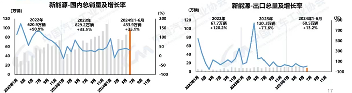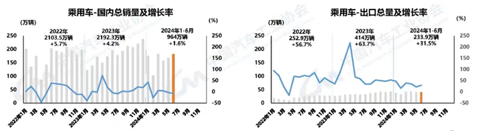 今年以來,汽車行業主要經濟指標呈現增長態勢。由于一季度同期基數相對偏低,增速超過兩位數,二季度后整體增速較一季度有所放緩。上半年,國內銷量同比微增,終端庫存高于正常水平;汽車出口保持快速增長,對拉動市場整體增長貢獻顯著,新能源汽車出口增速明顯放緩;新能源汽車產銷繼續保持較快增長,市場占有率穩步提升。