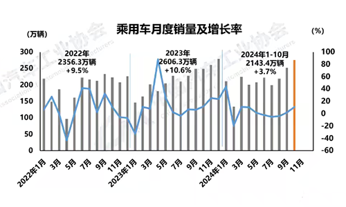 10月,汽車產銷分別完成299.6萬輛和305.3萬輛,環比分別增長7.2%和8.7%,同比分別增長3.6%和7%。1-10月,汽車產銷累計完成2446.6萬輛和2462.4萬輛,同比分別增長1.9%和2.7%。