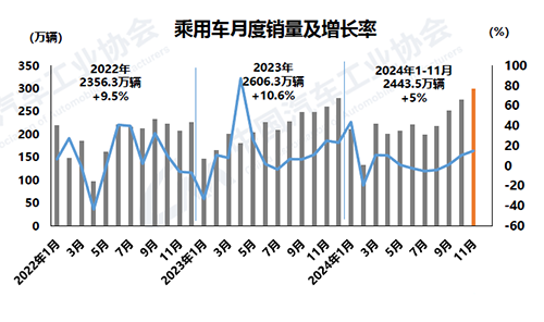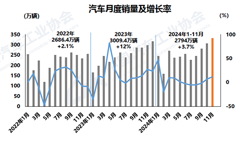 11月,汽車產銷分別完成343.7萬輛和331.6萬輛,環比分別增長14.7%和8.6%,同比分別增長11.1%和11.7%,月度產銷創歷史新高。1-11月,汽車產銷累計完成2790.3萬輛和2794萬輛,同比分別增長2.9%和3.7%。