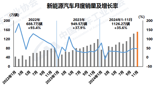 1-11月,新能源汽車產銷累計完成1134.5萬輛和1126.2萬輛,同比分別增長34.6%和35.6%,新能源汽車新車銷量達到汽車新車總銷量的40.3%。