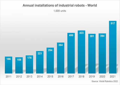 2021年全球新裝工業機器人達歷史高點,中國占比過半