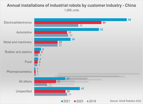 在這一數據背后,中國無疑是最大的亮點。2021年新裝機量遙遙領先于其他國家和地區,并首次在全球市場占比超過50%。體現出中國制造業向自動化發展的迅猛之勢。