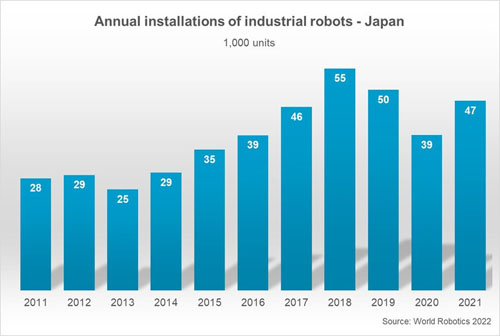2021年,日本繼續成為全球第二大工業機器人市場,雖然2019和2020連續兩年新機裝機量下降,但2021年實現了22%的增速,達到47182臺;在用保有量為393326臺,同比增長5%。日本不僅是重要的應用市場,也是世界主要的機器人生產國,其2021年工業機器人出口186102臺,達到歷史峰值。