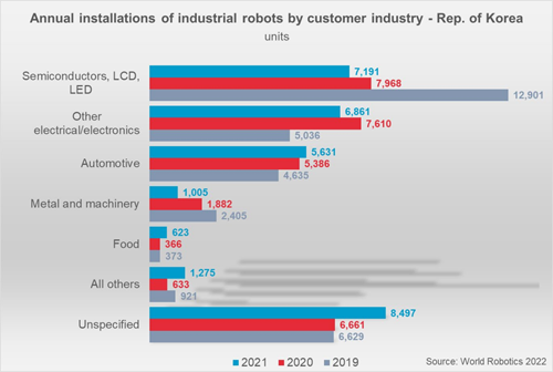 裝機數量連續四年下降之后,韓國在2021年的裝機量達到31083臺,同比增長2%,為全球第四大工業機器人市場。韓國的半導體、電子產業在全球具有很強的優勢,汽車產業也有一定規模,在這些行業的驅動下,韓國工業機器人密度位居全球第一位,2020年為制造業每萬人921臺,遠遠高于第二位新加坡,605/萬人和第三位日本,390/萬人。目前韓國工業機器人保有量為366227臺,同比增加7%。