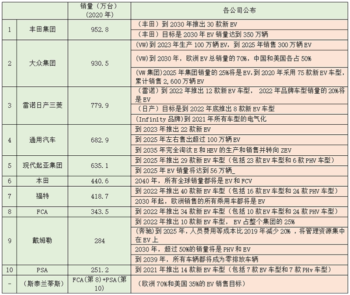注:排名第10的Stellantis是2020年FCA和PSA的合資企業(yè)。 EV公告是Stellatis的目標(biāo)值。