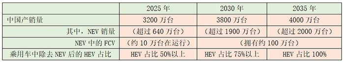 中國(guó)在2020年公布了《節(jié)能與新能源汽車(chē)路線圖2.0》,目標(biāo)是到2030年將NEV(新能源汽車(chē))在所有新車(chē)中的比例提高到50%。預(yù)計(jì)2030年產(chǎn)銷(xiāo)量將擴(kuò)大至3800萬(wàn)臺(tái),2035年將擴(kuò)大至4千萬(wàn)臺(tái)。如果其中一半以上是新能源汽車(chē),那么超過(guò)1900萬(wàn)輛將是PHV或更高級(jí)別的電動(dòng)汽車(chē)。中國(guó)的新能源汽車(chē)是包含PHV、EV和FCV,HEV定位為節(jié)能汽車(chē)。(表3)。