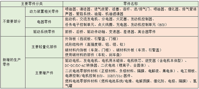 電動(dòng)汽車(chē)和機(jī)動(dòng)性所需的零部件及材料自然會(huì)比發(fā)動(dòng)機(jī)零部件增加。還應(yīng)考慮到,將使用許多具有化學(xué)產(chǎn)品特性的零件和材料,例如電池。表6是一個(gè)例子,預(yù)計(jì)這些新安裝部件的生產(chǎn)需要新的設(shè)備和機(jī)械。