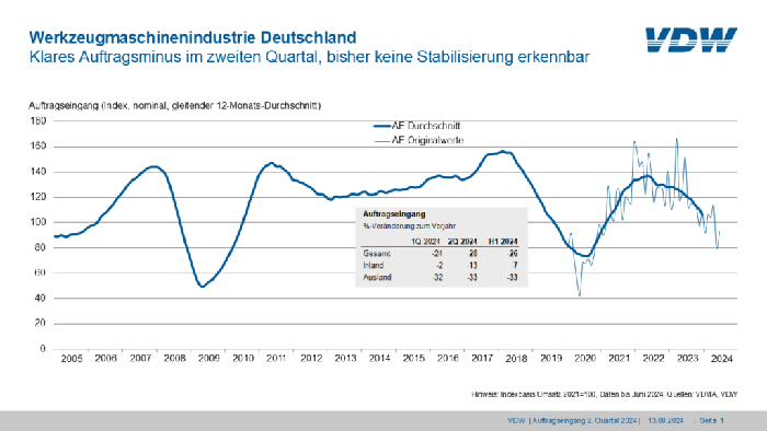 德國機床制造商協會(VDW)發布數據顯示,今年第二季度德國機床行業訂單同比下降28%,其中,國內訂單下降13%,國外訂單下降33%。2024年上半年,訂單同比下降了26%,其中,國內訂單下降7%,國外訂單下降33%。預計2024年的整體訂單量仍將大幅下降。VDW的預測合作伙伴Oxford Economics預計,2025年和2026年所有地區的機床需求將出現明顯的廣泛復蘇。