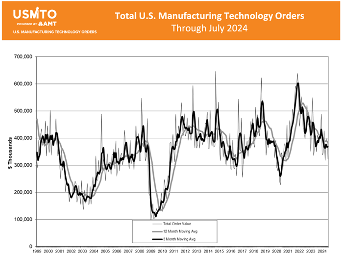 美國機械制造技術協會(AMT)發布數據顯示,7月制造技術訂單總額3.217億美元,環比下降19.3%,同比下降7.8%,1-7月訂單總額達到25.3億美元,同比下降10.5%。