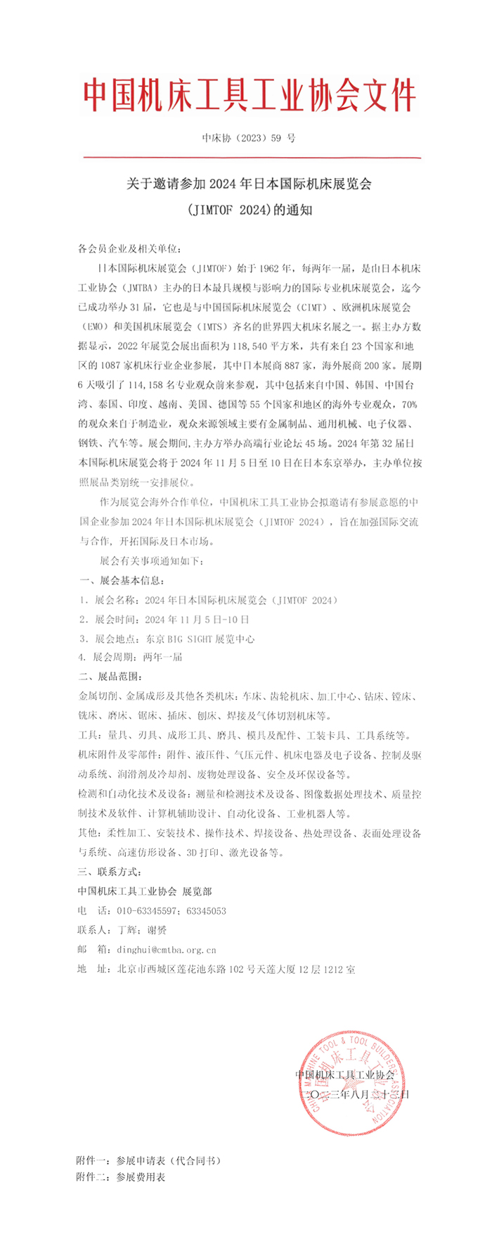 關于邀請參加2024年日本國際機床展覽會(JIMTOF 2024)的通知