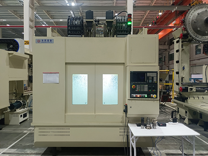該機是新能源壓鑄車身零件加工專機,配置偏置式雙擺角萬能銑頭、自動翻轉液壓夾具、鼓式直排刀庫,一次裝夾,可實現壓鑄車身結構件正反五面所有加工特征的高速、高精、高效自動加工。4臺CNC設備組線配置,與后續安裝拉鉚、壓鉚螺母、鋼絲螺套工位以及檢測工位等組成一體化車身鋁壓鑄零件加工機裝配生產線,滿足汽車主機廠產能和節拍需求。機床采用高剛度整體框架結構,移動部件采用超輕設計、各軸均采用電機直驅形式,配置鋁合金材質偏置式BC擺頭,提高機床動態性能,直線軸快進速度達到120m/min,加速度達到7m/s。研發自動翻轉工作臺,一次裝夾完成所有要素加工。同時根據零件數模,開展銑削特性研究與機床運動仿真,優化加工工藝路徑,形成總體工藝方案。該產品主要應用在新能源汽車大型壓鑄車身零件的高速高效加工。