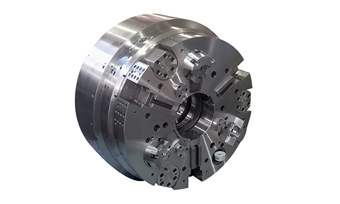 該卡盤是針對石油、天然氣管道加工行業所需的數控機床而研發的高端配套產品,具有全新性、高效性、安全性特點。卡盤采用四套機構,分別實現長徑比大的鋼管自定心夾緊、浮動夾緊、夾緊力損失補償和快進慢夾功能。先對工件前端進行自定心夾緊,然后進行浮動夾緊,減少工件的撓曲和變形,確保工件在加工過程中的穩定性和精確性。同時,通過與楔心套連接的滑座,經由不同的斜面完成卡盤的快進慢夾動作,實現卡盤的浮動夾緊功能。卡盤的夾緊力輔助補償功能由內部的蓄能裝置及滑座與盤體之間配置的配重塊來完成。另外,卡盤可與數控機床系統對接進行自動控制,實現遠程監控和自動化生產,降低人工勞動強度,提高工作安全性和生產效率。