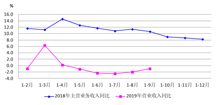 圖2為今年1-9月份營業收入同比變化與2018年主營業務收入同比變化的對比。由圖可見,2018年4月份達到14.6%的高點之后進入波動下行,但年末仍保持了8.3%的同比增長。而2019年除3、4月份為累計同比增長之外,其后月份一直為同比下降,7月份后下降幅度有所減緩,但今年前三季度行業下行壓力比去年感受更為明顯。