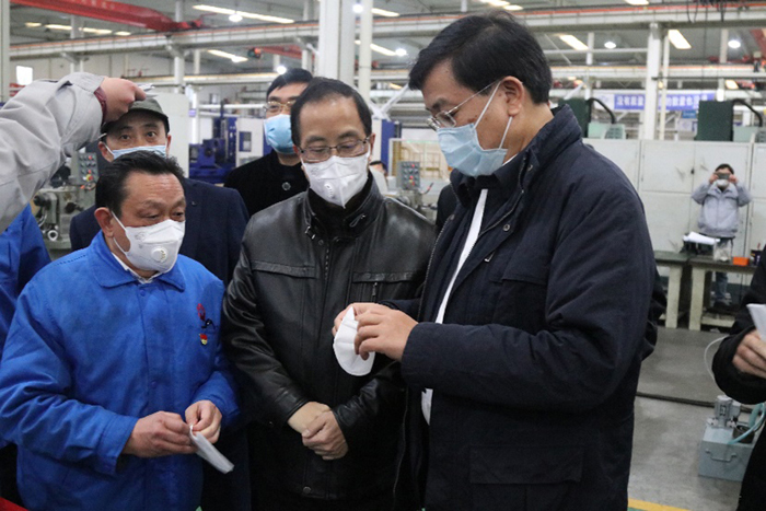 2月17日上午,四川省副省長王鳳朝一行蒞臨公司視察指導,重點就疫情防控急需設備——口罩機生產線研制情況進行了調研。公司黨委書記、總經理姜華,總工程師劉雁等陪同省市領導參觀了生產現場并進行了專題匯報,王副省長對寧江機床勇于擔當、努力作為的精神給予了充分肯定。